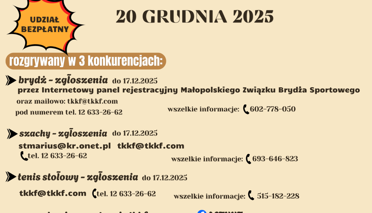 Regulamin szachy Regulamin brydż Regulamin tenis stołowy Karta zgłoszenia Zgoda rodziców Poprzedni wpis Finał Wojewódzki Cyklu Turniejów Grand Prix Małopolskiego TKKF w Tenisie Stołowym 13.12.2025 r. Zobacz też Tenis stołowy Sprawozdanie z cyklu Otwartych Turniejów „Grand Prix” Małopolskiego TKKF –„Zima 2020” w Tenisie Stołowym 9 marca 2020 Tenis stołowy III Turniej Grand Prix Małopolskiego TKKF w tenisie stołowym 08.06.2024 28 maja 2024 Tenis stołowy Otwarty Turniej Tenisa Stołowego o Puchar „Ligi Czarnej Kawy” z okazji 70-lecia Nowej Huty 8 maja 2019